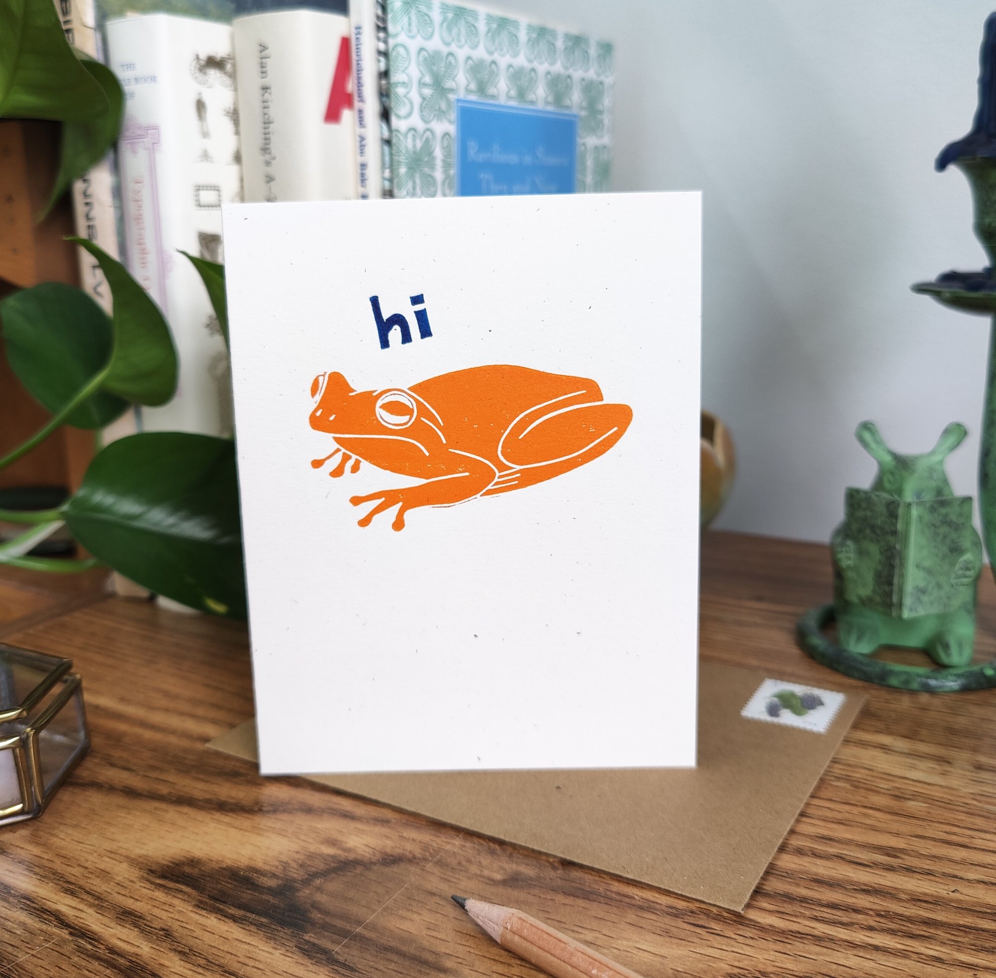 Send a little "hi" in the mail with this friendly orange tree frog. Good for any occasion!
