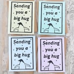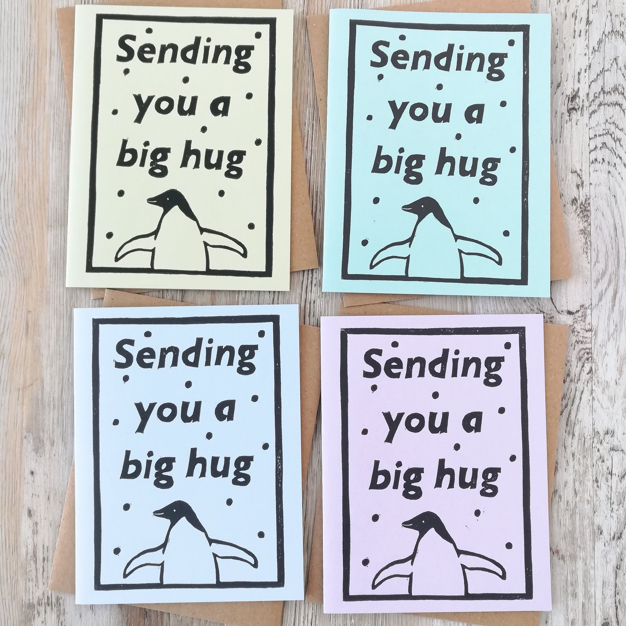 Send a friend or family member a big hug when they need it with this cute penguin card. Drawn, carved, and printed by hand.